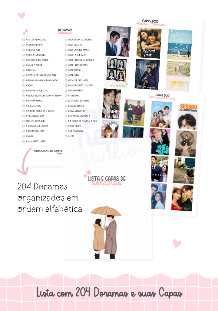 Ainda inclui 204 doramas organizados com suas capinhas, seções redesenhadas e estrutura pronta para quem quer imprimir, encadernar e vender para um público apaixonado — e que já está procurando exatamente isso.
